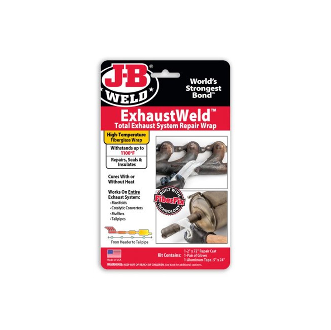 JB Weld Total Exhaust Repair Wrap eller kort och gott JB Weld Exhaust Weld är ett mycket starkt glasfiber wrap, impregnerat med en särskild sorts härdare för permanenta högtemperatursreparationer . Innehåller ett 5 cm brett och 182 cm långt förband, ett par handskar och aluminium tape.