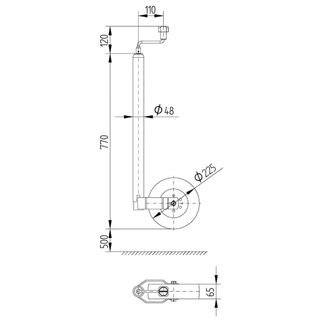 Stödhjul förlängt 48mm med massivt hjul 225×65 stålfälg